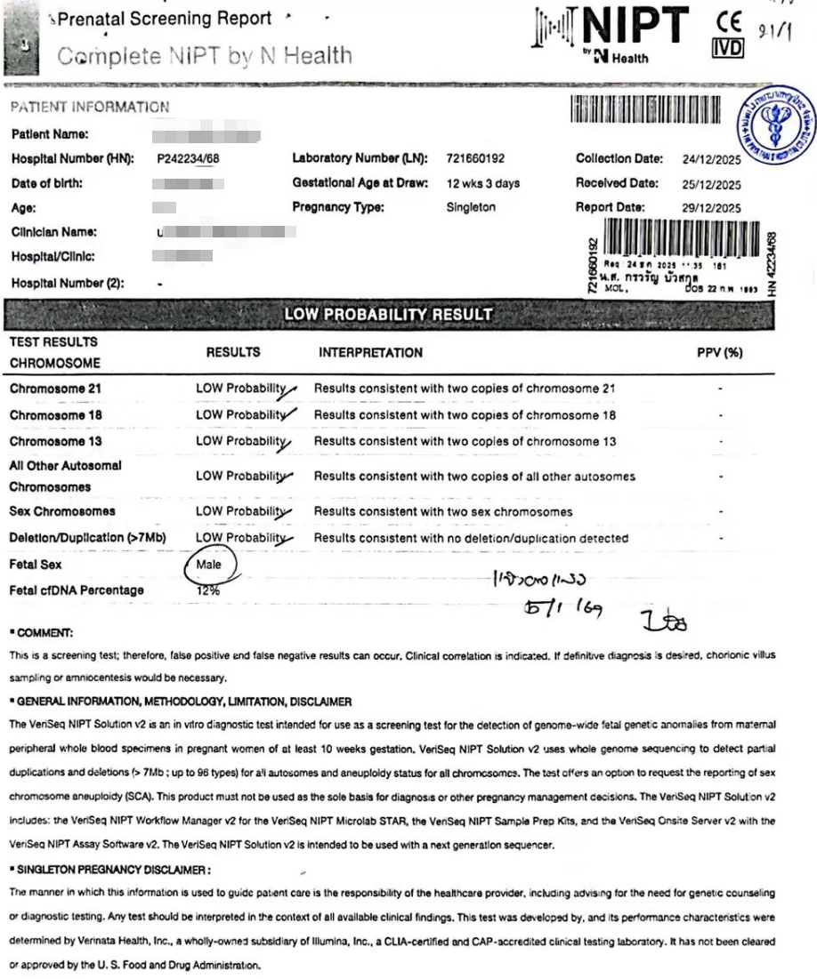 1月29日,無創檢測(NIPT)報告出爐——結果為低風險,各項指標完全正常! 報告顯示是個健康的男寶寶!👏